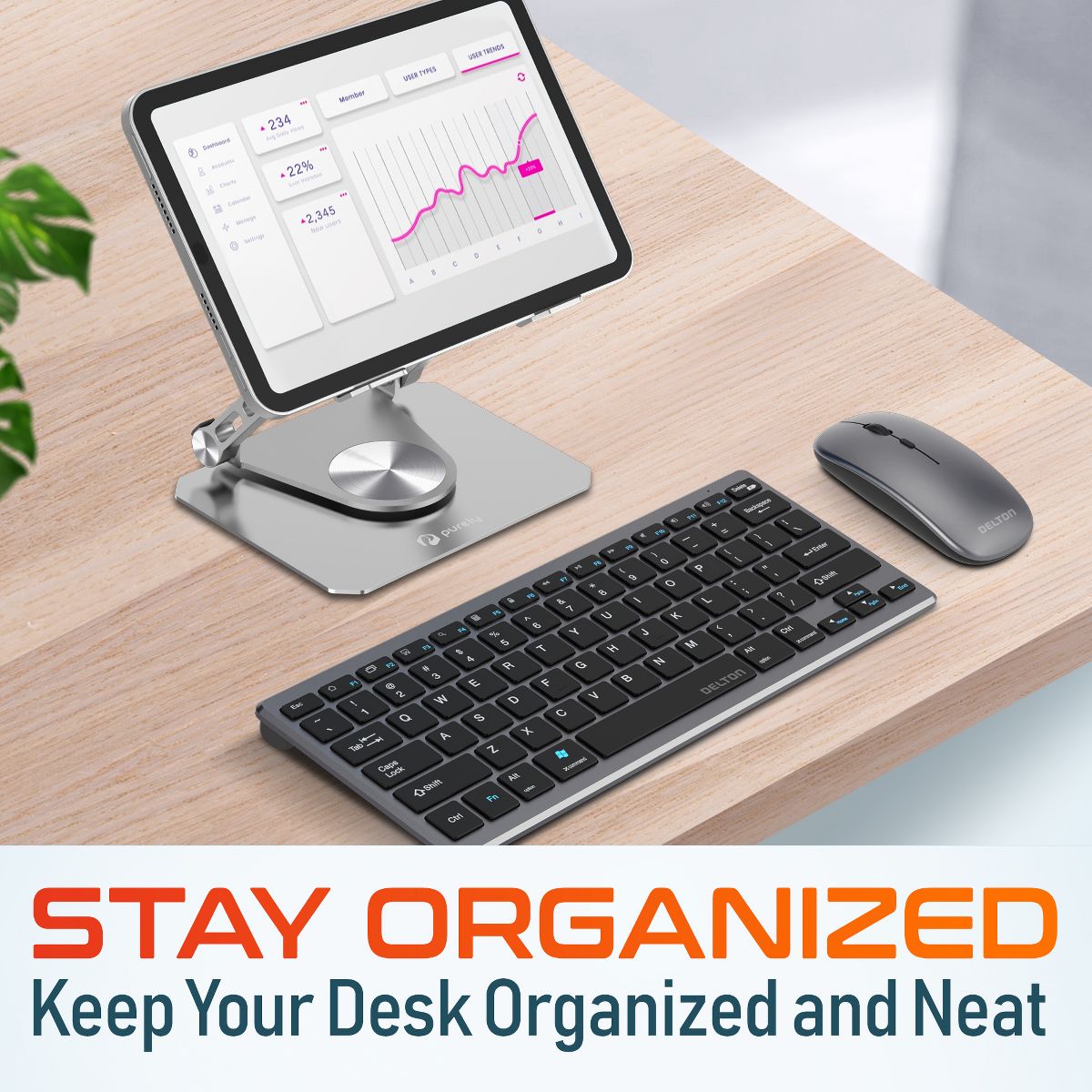 Delton SW60 iPad/Android Stand & N35 Small Wireless Keyboard and Mouse Tablet Accessory Set, Silver