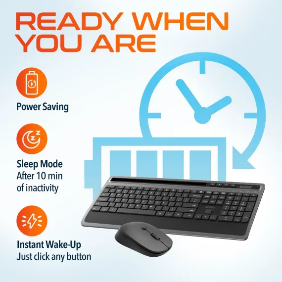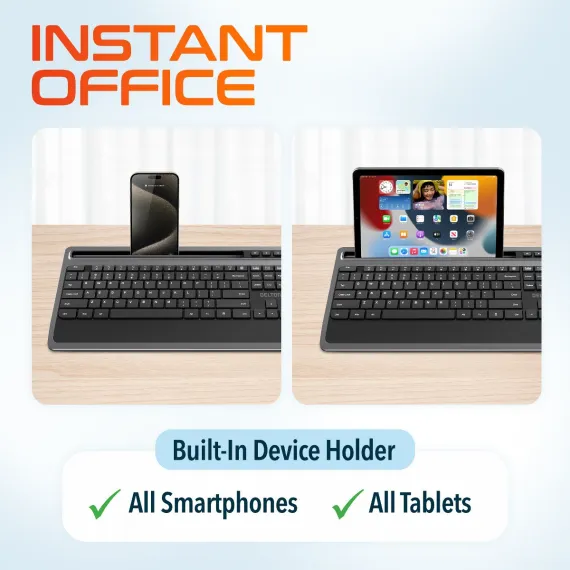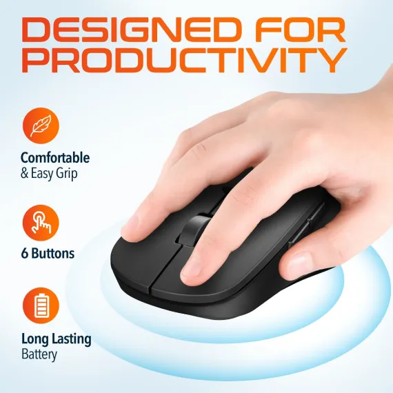 Enhance your productivity with the Delton T42 keyboard and M42 mouse combo, expertly designed for comfort and functionality. The full-sized 114-key wireless keyboard features a slim profile, numeric keypad, and 12 multimedia keys for easy access to shortcuts, while the tablet slot at the top offers convenient multi-device use. Paired with a wireless ergonomic mouse that includes six buttons for efficient navigation, customizable DPI settings (800, 1200, 1600), and precise optical tracking, this wireless keyboard mouse combo is ideal for extended work sessions. Enjoy seamless 2.4 GHz wireless connectivity with a 30ft range for both devices using a single USB dongle, ensuring clutter-free convenience.