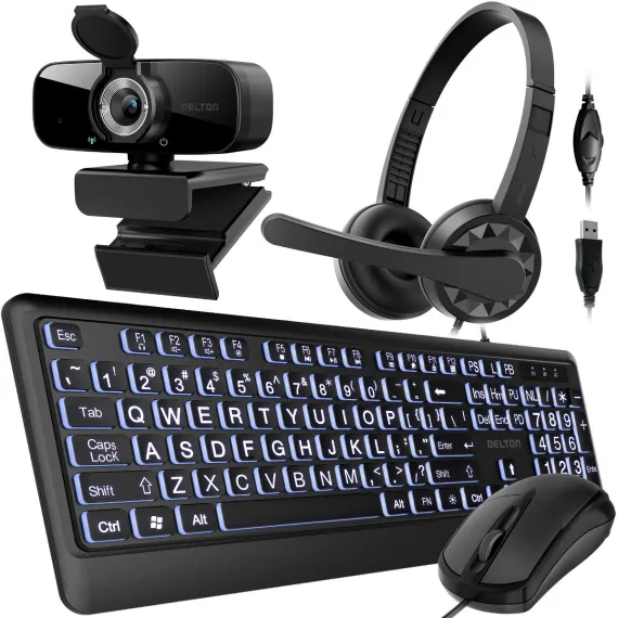 Delton Work Anywhere 12Y USB Headset, 1080p Webcam, Big-Key USB Keyboard & Mouse Bundle, Black