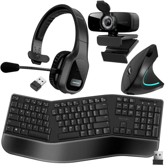 Optimize your workspace with the Delton Work Anywhere Kit, featuring the versatile Delton 20X noise cancelling headset for work, a high-definition 1080p webcam, a responsive wireless computer keyboard, and an ergonomically designed 6 button mouse. The computer headset ensures excellent audio clarity with Bluetooth 5.0 connectivity, a noise-canceling mic, and up to 35 hours of talk time or 40 hours of playtime, all supported by Type C fast charging. Our full HD webcam delivers sharp visuals, including autofocus, auto white balance, and a privacy lens cap for secure, high-quality video calls. The whisper-quiet full mechanical keyboard, with its full-sized layout and pillowed wrist rest, offers a comfortable and precise typing experience, while the ergonomic wireless mouse features customizable DPI settings and a 3D scroll wheel for enhanced navigation. This bundle provides a seamless integration of comfort and technology, suitable for any professional environment.