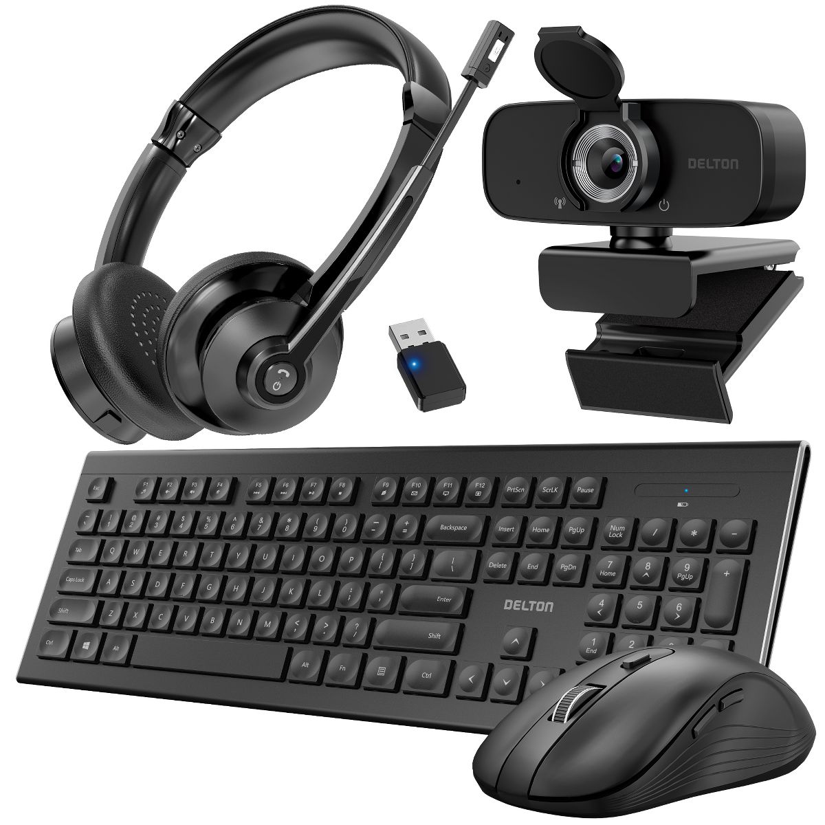 Delton Work Anywhere 30X Wireless Noise Canceling Bluetooth Stereo Computer Headset Kit with Webcam, Wireless Keyboard & Mouse, Black