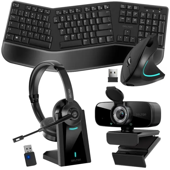 Delton Work Anywhere 35X Wireless Noise Canceling Bluetooth Stereo Computer Headset Kit with 1080p Webcam, Ergonomic Wireless Keyboard & Mouse, Black