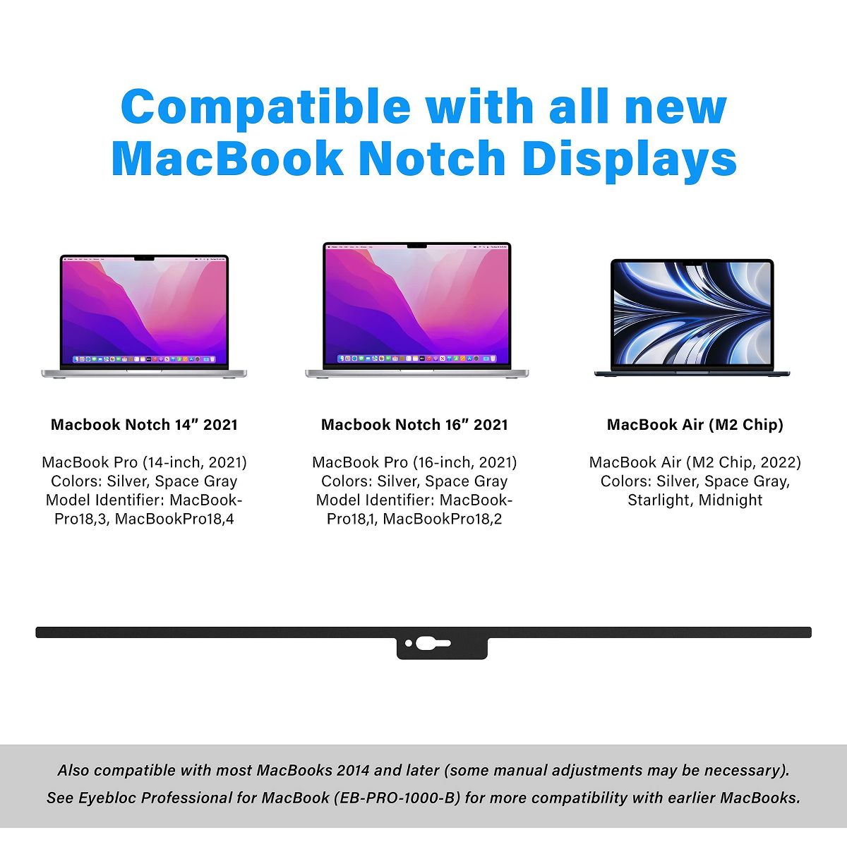 Eyebloc Webcam Cover for Macbook Notch Series 2022. Designed for all 2021/2022 MacBook Air & MacBook Pro Notch Displays. * Also compatible with most Macbook models 2014-2021, manual adjustments may be necessary. Also see - Eyebloc Professional Webcam Cover for MacBook (EB-PRO-1000-B) for compatibility with older MacBooks. Technical info Length 9.06" (230mm) x Height .39" (9.80mm) x Depth .01" (.2mm) Weight .40oz (12.6g)