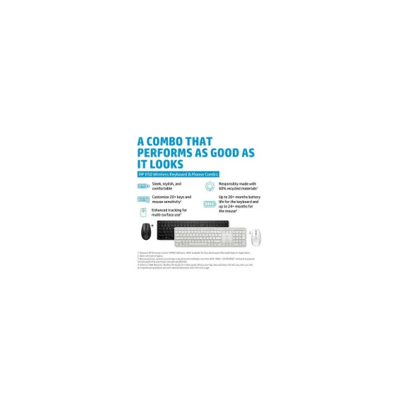 Overview - Now you can get everything you want in a wireless keyboard and mouse combo – comfort, productivity, reliability and style. Customize the functions of 20+ keys and enjoy precise mouse tracking to work faster and smarter. This combo contains recycled materials and they're also easy to keep clean and sanitary. What's in the box? - Wireless keyboard; Wireless mouse; USB dongle; 2 x AA batteries; 2 x AAA batteries; Quick start guide; Warranty card; R.E.D. Card (EMEA only) Disclaimers - Requires HP Accessory Center (HPAC) Software. HPAC available for free download in Microsoft Store or Apple Store. - Recycled plastic content percentage is based on the definition set in the IEEE 1680.1-2018 EPEAT standard. Keyboard contains 62% PCR and mouse contains 69.8% PCR. - Select household wipes can be safely used to clean HP 650 Wireless Keyboard & Mouse Combo up to 1,000 wipes: See wipe manufacturer’s instructions for disinfecting and the HP cleaning guide for HP-tested wipe solutions at (How to Sanitize Your HP Device Whitepaper (http://h20195.www2.hp.com/v2/GetDocument.aspx?docname=4AA7-7610ENW) - Does not track on glass. - Battery life is an estimate and varies depending on many factors, including number of active, idle and asleep hours of use, number of applications running, environmental conditions and features used; actual battery life will vary with usage and environmental condition. The maximum capacity of battery will naturally decrease with time and usage. - Recycled plastic content percentage is based on the definition set in the IEEE 1680.1-2018 EPEAT® standard.