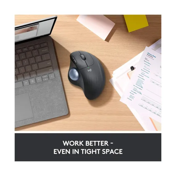 The Logitech Ergo M575 Wireless Trackball is a wireless trackball mouse that is designed to reduce hand movement and keep the hand and arm relaxed. It has five buttons, three of which are programmable. It can connect to Windows, macOS, Chrome OS, and Linux computers using either Bluetooth or the included Logitech Unifying wireless dongle. The Ergo M575 has a compact footprint and is ideal for tight workspaces