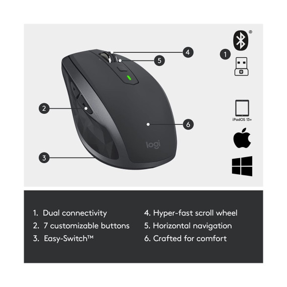 MX Anywhere 2S is the performance mouse that works everywhere, from café tables to airline seats. Its 4000-dpi Darkfield sensor tracks flawlessly virtually anywhere, even on glass (min. 4mm thick).Combine MX Anywhere 2S with a Logitech Easy-Switch keyboard and desktop speakers for a fully integrated wireless system designed to help you work more efficiently and comfortably.