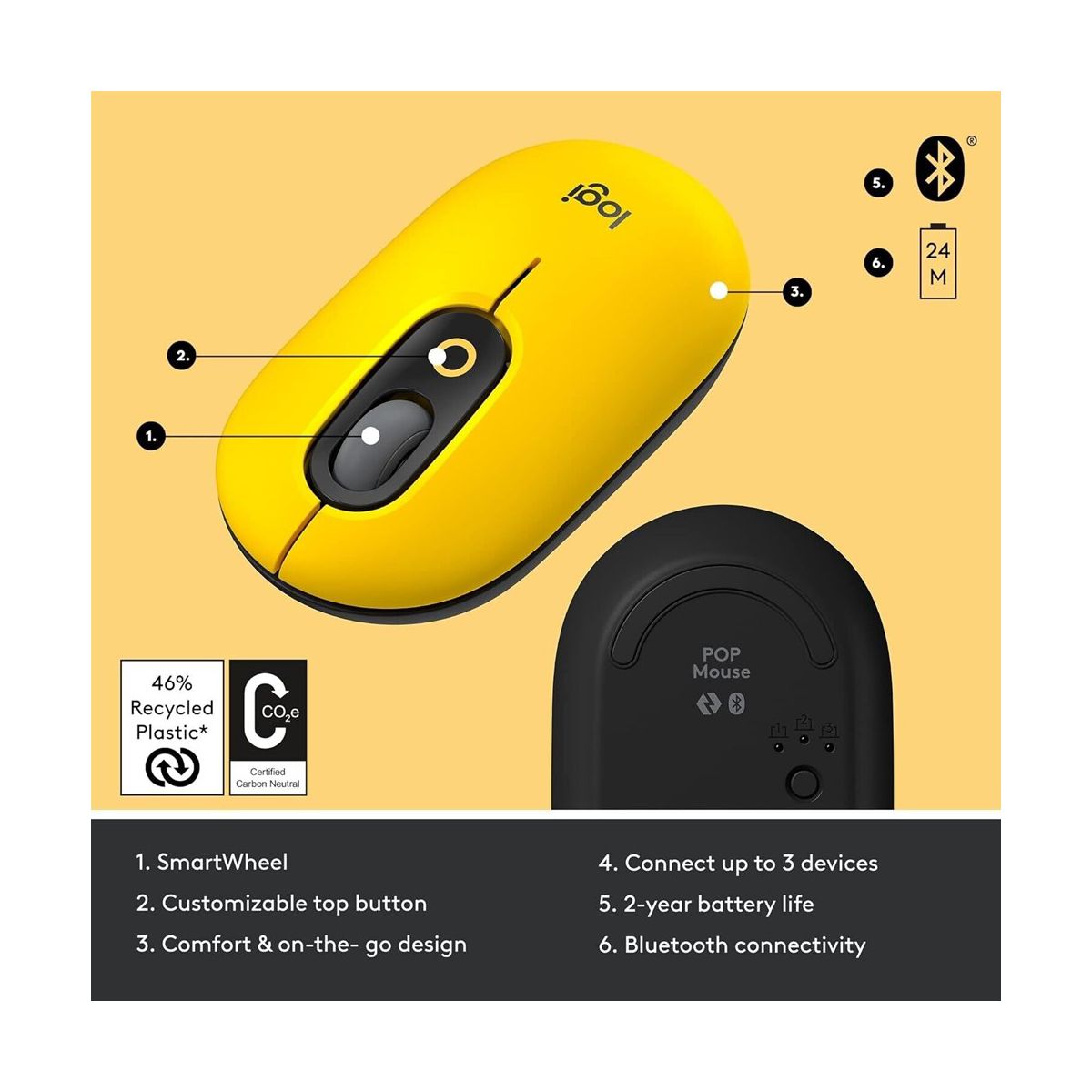 Logitech POP Mouse - Silent Wireless Mouse Let personality POP on your deskspace and beyond with POP Mouse, your whisper-quiet, wireless mouse with fresh customization features. Take your self-expression further and download Logitech Software to customize the top button. Give it your own twist by assigning it to send your favorite emoji or another shortcut - such as Snip Screen, Mic Mute or Voice-to-Text. POP Mouse fits comfortably in your hand and slips easily into your pocket, handbag or computer case. SilentTouch technology makes every click whisper-quiet. The portable mouse's SmartWheel stays in sync with you, easily shifting from high-precision to speed scroll mode. Pair POP Mouse with up to 3 different devices at once, and use the Easy-Switch button to toggle between them. Alternatively, activate FLOW and glide between screens as you work, transferring text, files and images with a simple copy and paste. Connect the cordless mouse to your desktop, tablet or phone* using Bluetooth or a Logi Bolt USB receiver which you can purchase separately. With a classic Logitech promise of durability, POP Mouse is your companion for the long haul, with up to 24-month battery life** and auto-sleep power-saving technology that helps it last. Product details: Number of buttons: 4 Top button customizable with Emoji Software Sensor technology: Logitech High Precision Optical Tracking Battery type: 1 x AA battery (included) Battery life: Up to 24 months** Connection type: Bluetooth 5.1 Compatible with Logi Bolt USB receiver Wireless range: 32.81 ft (10 m) Compatible with Windows 10 or later, macOS 10.15 or later, iPadOS, Chrome OS and Android *Windows, macOS, Chrome OS, Android, iPadOS **Battery life may vary based on use and computing conditions.