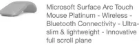 Microsoft Surface Arc Touch Mouse Platinum The travel companion for your Surface Slim, light, and ready to travel, Surface Arc Mouse is designed to conform to your hand - and snaps flat to fit easily in your bag. The next generation of our best-selling Arc Touch Bluetooth Mouse, Surface Arc Mouse features numerous refinements, including the ability to scroll both vertically and horizontally. Connects via Bluetooth. Slim, light, and ready to travel Ultra-slim and lightweight, Surface Arc Mouse goes anywhere without the weight or bulk of traditional mice. Just snap it flat and easily slip it in your pocket or bag.