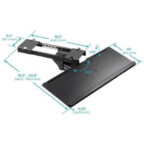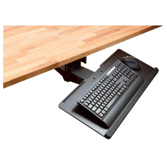 Adjustments are easy to make, just turn the adjustment knob to move and lock the keyboard tray in place. The full-sized work surface provides ample room for a standard mouse and keyboard and keeps them on the same plane for better comfort. Quality steel and composite wood materials ensure stability and durability to survive daily use. This keyboard tray works with most standard desks with at least 18 inches of flat under-table space.