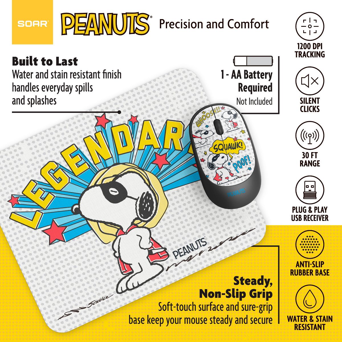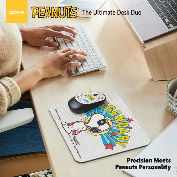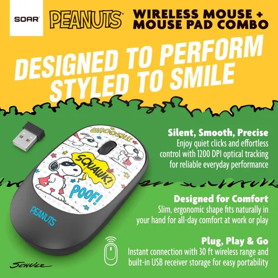 The Peanuts Mouse & Mouse Pad Combo adds a touch of Snoopy fun to your workspace. The 2.4GHz wireless mouse offers smooth, silent clicks and precise 1200 DPI optical tracking, while the soft-touch mouse pad provides a water-resistant surface and non-slip rubber base for steady use. Easy plug-and-play setup with a USB receiver means you’re ready to work or play in seconds. Officially Licensed Peanuts Product, ideal for home, office, or school use.