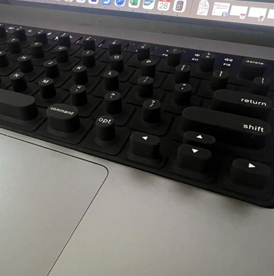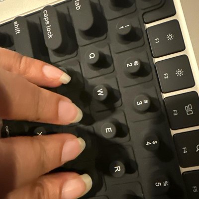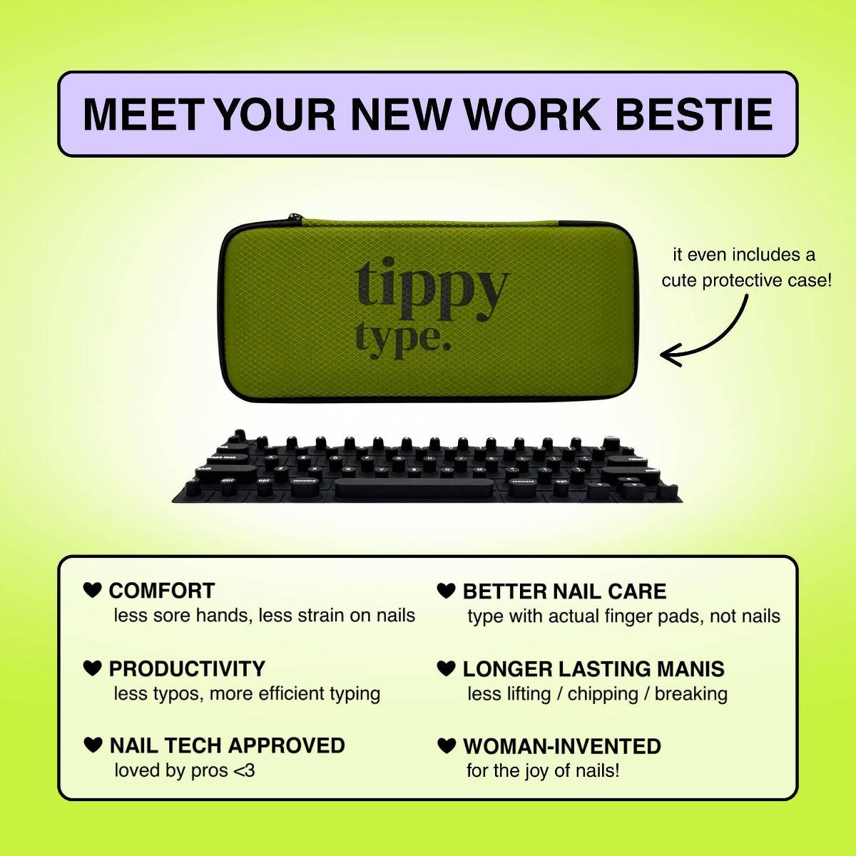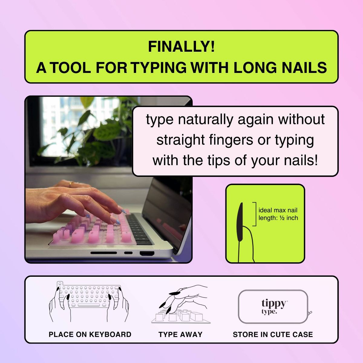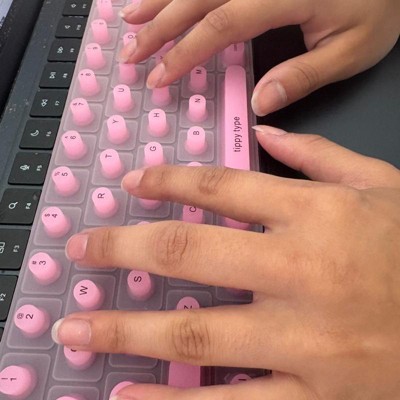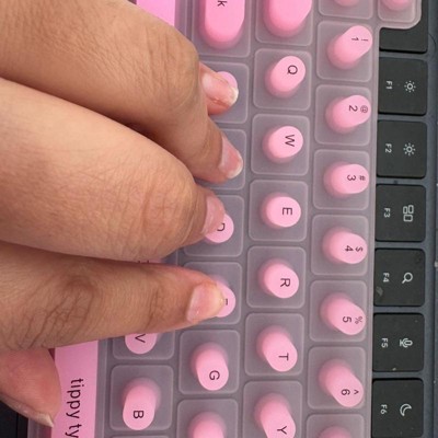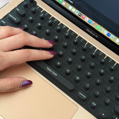 Struggling to type with long nails? tippy type is a woman-invented, patent pending, first-of-its-kind manicure-friendly keyboard cover designed just for you. Made from high-quality, velvety-soft silicone, tippy type features raised keys that support natural hand positioning, reduce finger soreness, and help you type comfortably and quietly—no more annoying "clack-clack" sounds. By allowing you to use your actual fingertips instead of your nail tips, it helps extend the life of your manicure and minimize damage to your nailbeds. Nail tech-approved and built for productivity, tippy type improves accuracy and reduces typos so you can type faster, work smarter, and keep your stylish nails looking flawless. Plus, every tippy type comes with a cute protective case perfect for when you are on the go. tippy type is compatible with Apple devices (USA Versions only): MacBook Pro (14" & 16" [2021+], 13" & 15" [2016+]), MacBook Air (13" [2020+], 15" [2023+]), Magic Keyboard (without Numeric Pad), iPad 13-inch Magic Keyboard.