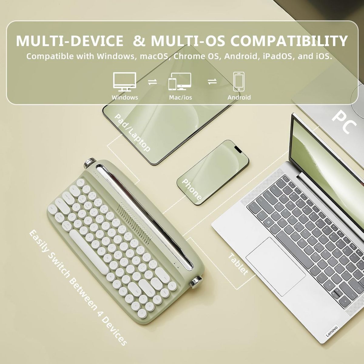 Wire/Wireless Typewriter Keyboard, USB-C/Bluetooth Connection, Cute Retro Aesthetic Design with Integrated Stand for Tablet, Phone, Win/Mac/Android
