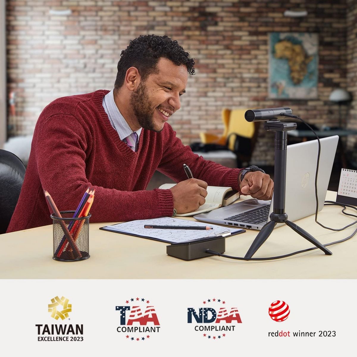The DUALCAM PW313D is a 2-in-1 webcam equipped with two cameras to capture two different angles simultaneously. The combination of a webcam and doc cam captures both yourself and any other object or documents on your table. It is a reliable video and audio device for video conferences, online teaching, and online tutoring.