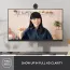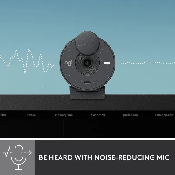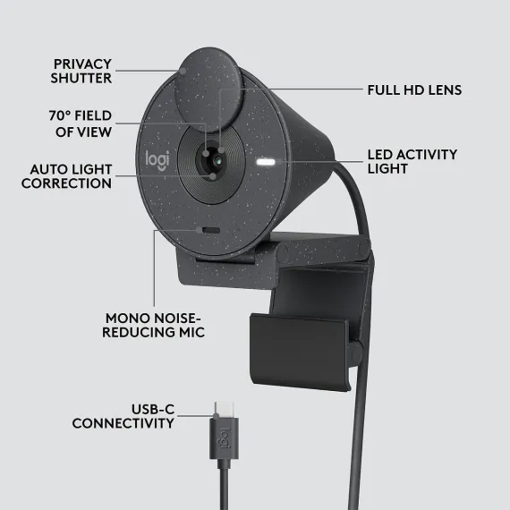 Logitech Brio webcam. Say hello to better video meetings. Place Brio 300 at your best angle for an eye-to-eye connection. Look natural thanks to 1080p resolution and auto light correction for low-light situations. A noise-reducing mic suppresses background noise so others can hear you clearly. Spin the easy-to-use privacy shutter to cover the lens between calls. Brio 300 is certified for Microsoft Teams, Google Meet, and Zoom, so you can enjoy hassle-free meetings. Add a dash of personality to your workspace with a modern shape and a subtly speckled design made from at least 48% recycled plastic.