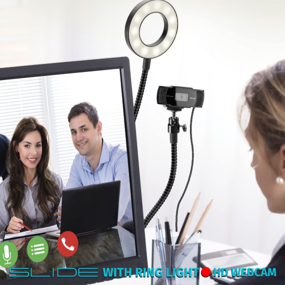 Present yourself from a new perspective ' literally! The Slide Innovations Full HD Webcam with Studio Selfie Ring Light allows you to record yourself during livestreams, conference calls, zoom virtual meetings, as well as show yourself off when recording videos or taking screenshot photos. With its crisp and clear full high definition quality, the webcam ensures that everyone who'll be watching you will be able to do so with ease and clarity ' no pixelation, no fuzziness, no 160p quality! This is top-notch video equipment without breaking the bank. To further make the experience more pleasant, and perhaps even customizable, the included ring light for phone has 30 different brightness options for you to choose from! Find the best one for yourself, or select a brightness level that complements the room's lighting. And speaking of rooms, you don't even have to be in one to take advantage of the camera! Thanks to its flexible gooseneck design (as well as the light's gooseneck), you can customize interesting and fitting viewing angles ' no need to have the camera directly point at you when you can have it point from down below, from the side, or even from up above.