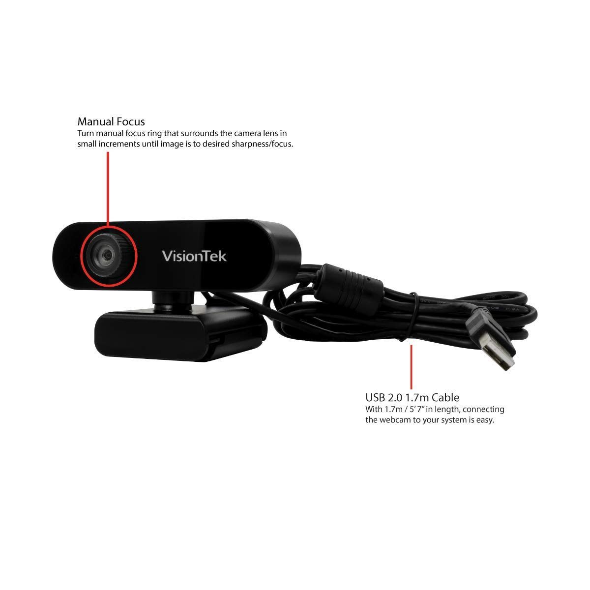 With the VisionTek VTWC30 Webcam, video chatting and gaming is a breeze. This 1080P Full HD webcam with omni-directional microphone captures video in perfect detail and vibrant color.With its manual focus lens and 83-degree viewing angle, you'll be sure to look your best during every video call. Whether streaming in your game room or video conferencing in the office, your webcam is compatible with most software, including MS Teams, Zoom, Skype, and more. No drivers are needed so you can plug it in and start using it right away. This USB Webcam features a privacy cover that shields the lens when not in use. Rest assured your voice will be heard clearly thanks to the built-in digital dual microphones. Find your perfect angle; attach the camera to a tripod or camera mount for greater positioning options. With the VisionTek video camera for your computer, your online meetings and hangouts will be smooth and trouble-free.
