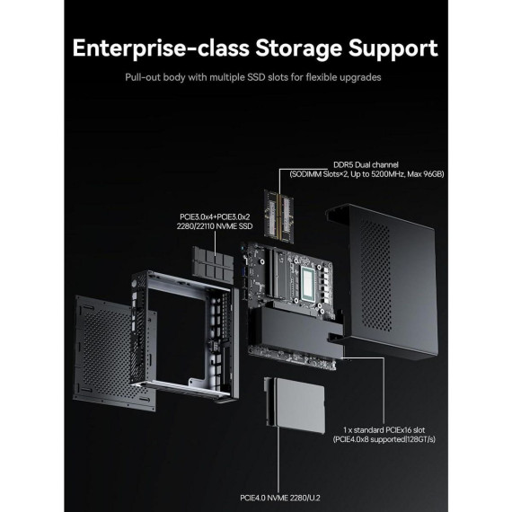 For expandability, it features a PCIe 4.0 x16 slot for adding a powerful external GPU and supports massive enterprise-class storage, with room for multiple high-speed SSDs and a total capacity of up to 24TB.