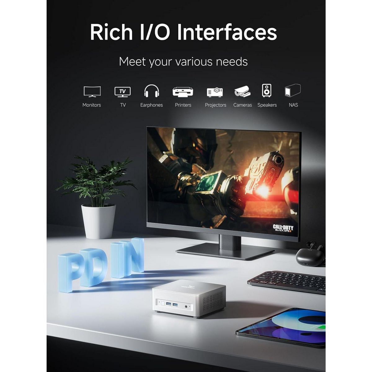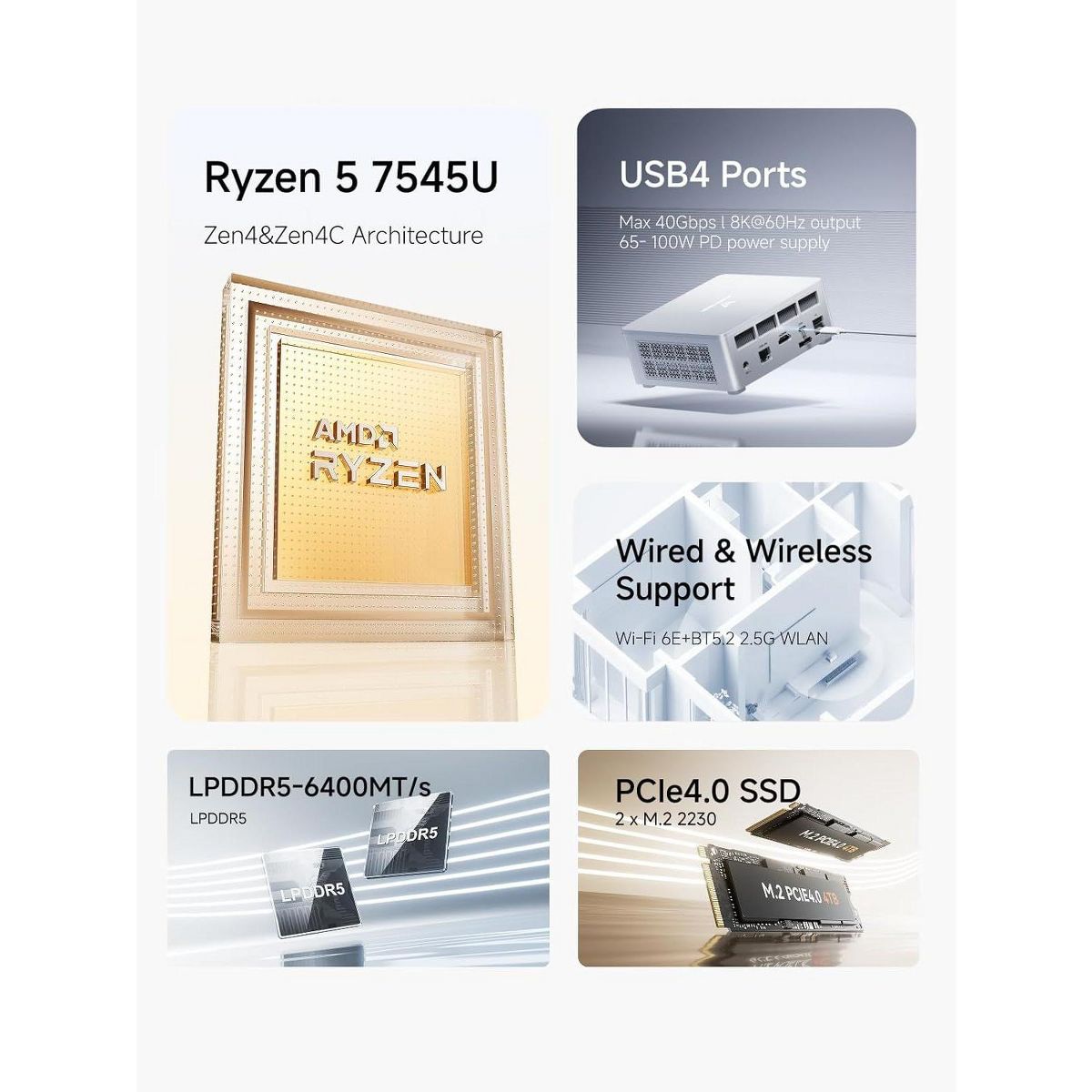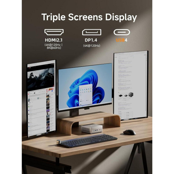 The UM750L Slim mini PC is a compact powerhouse designed for both productivity and entertainment. At its core is the powerful AMD Ryzen 5 7545U processor, which delivers impressive performance with 6 cores and 12 threads, effortlessly handling everything from complex computing tasks to high-intensity gaming. Boost your workflow with its triple-screen display capability, supporting stunning 8K or high-refresh 4K outputs across three monitors simultaneously. It comes ready to perform with 16GB of fast LPDDR5 RAM and a 1TB PCIe 4.0 SSD, offering blazing-fast data speeds and ample room for expansion up to 4TB. Despite its powerful internals, it remains cool and quiet under pressure thanks to an advanced cooling system that combines phase-change materials and active heatsinks, ensuring efficient and stable performance even during extended use.