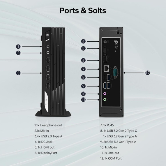 Its compact MFF (Mini Form Factor) design fits easily into limited workspace environments. The device features a wide range of connectivity options, including USB Type-A and Type-C ports, HDMI and DisplayPort outputs, audio jacks, and RJ45 for wired networking.