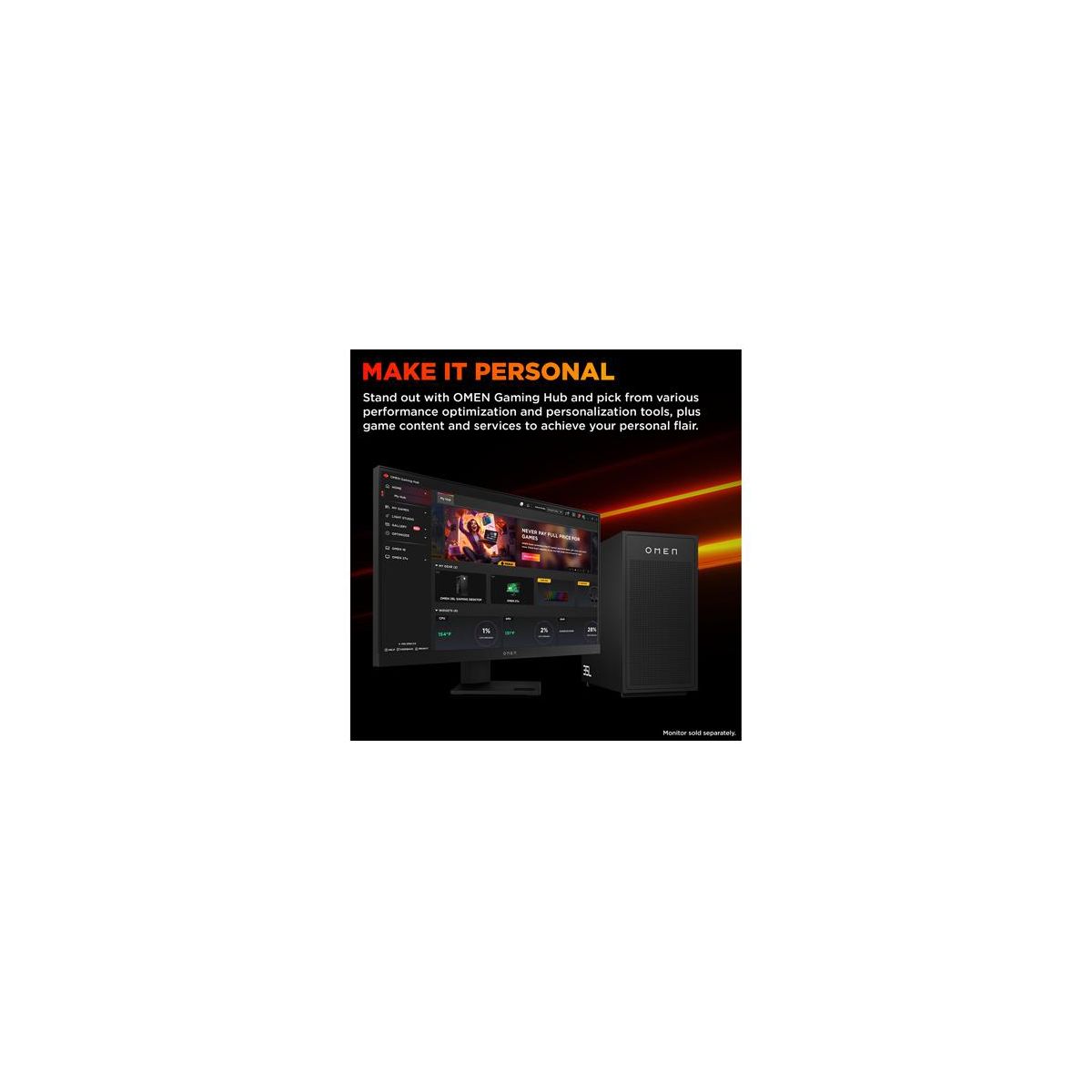 Overview - The OMEN 35L Gaming Desktop PC unlocks your performance potential. It features the latest AMD Ryzen™ Processor and advanced graphics, with OMEN branded components optimized for peak thermal capabilities and power. Designed for easy tool-less upgradeability and personalization to suit your gaming needs. Features Built for stealth - All-black design with no RGB, delivering a bold yet subtle look that defines your setup. Optimized for performance - Play to your highest potential with a design that is optimized for performance. Futureproof, tool-less design - Designed for upgradability with OMEN Components, expand and customize within an industry-standard form factor. We're in this together - It matters. With 100% recyclable packaging solutions, at least 20% recycled plastic content and 10% recycled metal, we are in this together. Software included - McAfee Online Protection 30-day trial; PC Game Pass 3-month trial Disclaimers - Multi-core is designed to improve performance of certain software products. Not all customers or software applications will necessarily benefit from use of this technology. Performance and clock frequency will vary depending on application workload and your hardware and software configurations. AMD’s numbering, branding and/or naming is not a measurement of higher performance. - Recycling facilities not available in all locations. - Recycled plastic is expressed as a percentage of the total weight plastic. Post-consumer recycled is based on the definition set in the EPEAT standard for computers, IEEE 1680.1-2018 standard. - Recycled metal is expressed as a percentage of the total weight of the metal according to ISO 14021 definitions for metal parts over 25 grams. - ©2025 NVIDIA Corporation. NVIDIA, the NVIDIA logo, GeForce, and GeForce RTX are registered trademarks and/or trademarks of NVIDIA Corporation in the United States and other countries. All other trademarks and copyrights are the property of their respective owners. - Not all features are available in all editions or versions of Windows. Systems may require upgraded and/or separately purchased hardware, drivers, software or BIOS update to take full advantage of Windows functionality. Windows is automatically updated and enabled. High speed internet and Microsoft account required. ISP fees may apply and additional requirements may apply over time for updates. - Multi-core is designed to improve performance of certain software products. Not all customers or software applications will necessarily benefit from use of this technology. Performance and clock frequency will vary depending on application workload and your hardware and software configurations. AMD’s numbering is not a measurement of clock speed. - For hard drives, GB = 1 billion bytes. TB = 1 trillion bytes. Actual formatted capacity is less. Up to 35GB of system disk is reserved for system recovery software. - Listening to personal stereo equipment at full volume for long periods can damage the user’s hearing. To reduce the risk of hearing damage, lower the volume and amount of time listening at full volume. - Actual throughput may vary. USB Type-C® and USB-C® are trademarks of USB Implementers Forum. - PC Game Pass: Subscription continues automatically at regular monthly price unless cancelled. Subject to xbox.com/subscriptionterms. Terms and exclusions apply. Game catalog varies over time, by region, and by device. All rights reserved. Xbox.com/pcgamepass, ea.com/ea-play/terms.Three month trial for devices purchased after October 2024. Microsoft account required. Offers available in select regions only. Credit card required. After promotional period, subscription automatically continues at the then-current regular price (subject to change), unless cancelled, plus applicable taxes. For cancellation details, seexbox.com/cancel