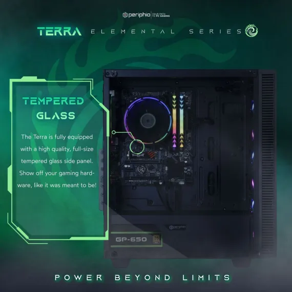 [More About the System] Part of our Elemental Series, the Terra features a quintessential classic gamer vibe, with 3 bold RGB fans behind a high-quality tempered glass fascia, supported by an ATX footprint. It's all-Black design allows the RGB to stand out even more, and the top-to-bottom tempered glass side-panel allows viewers to see inside, so you can show off your hardware like it was meant to be! Positioned as the perfect entry into PC Gaming, the Periphio Terra embodies a future-proof design and plenty of PSU overhead for the budding PC enthusiast!