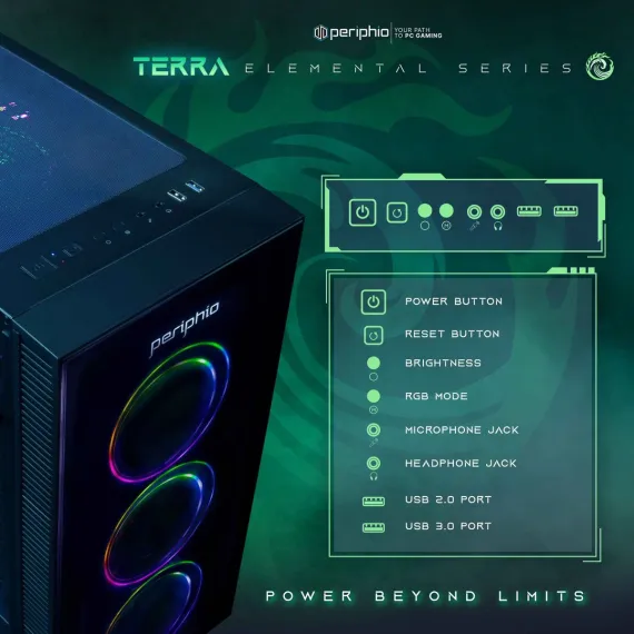 [More About the Gaming Desktop] Part of our Elemental Series, the Terra features a quintessential classic gamer vibe, with 3 bold RGB fans behind a high-quality tempered glass fascia, supported by an ATX footprint. Its all-Black design allows the RGB to stand out even more, and the top-to-bottom tempered glass side-panel allows viewers to see inside, so you can show off your hardware like it was meant to be! Positioned as the perfect entry into PC Gaming, the Periphio Terra embodies a future-proof design and plenty of PSU overhead for the budding PC enthusiast!