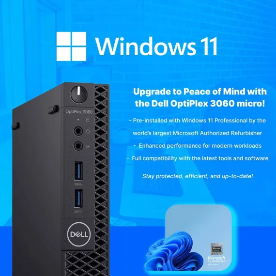 The Dell Optiplex 3060 Micro is a dependable, space-saving computer built for home, school, and family use. Powered by an Intel Core i5 8th Gen Hexa-Core processor, 8GB DDR4 RAM, and a 250GB SSD Solid State, it offers smooth, responsive performance for everyday tasks like schoolwork, web browsing and streaming your favorite shows. With Windows 11 Pro and WiFi/Bluetooth this PC is ready to help users stay connected, creative, and productive right out of the box. Family Friendly Setup with Reliable Connectivity - Windows 11 Pro Pre-Installed - Wifi and Bluetooth - Features a variety of ports including USB ports, DisplayPort, HDMI, Ethernet, and audio in/out, making it easy to connect to monitors, headphones, printers, and school accessories. - Included accessories detailed in image gallery. As a Microsoft Authorized Refurbisher, BlairTech professionally renews each system through rigorous testing and certification. The Dell Optiplex 3060 Micro is a smart, sustainable solution for families and students seeking reliable performance in a compact package.