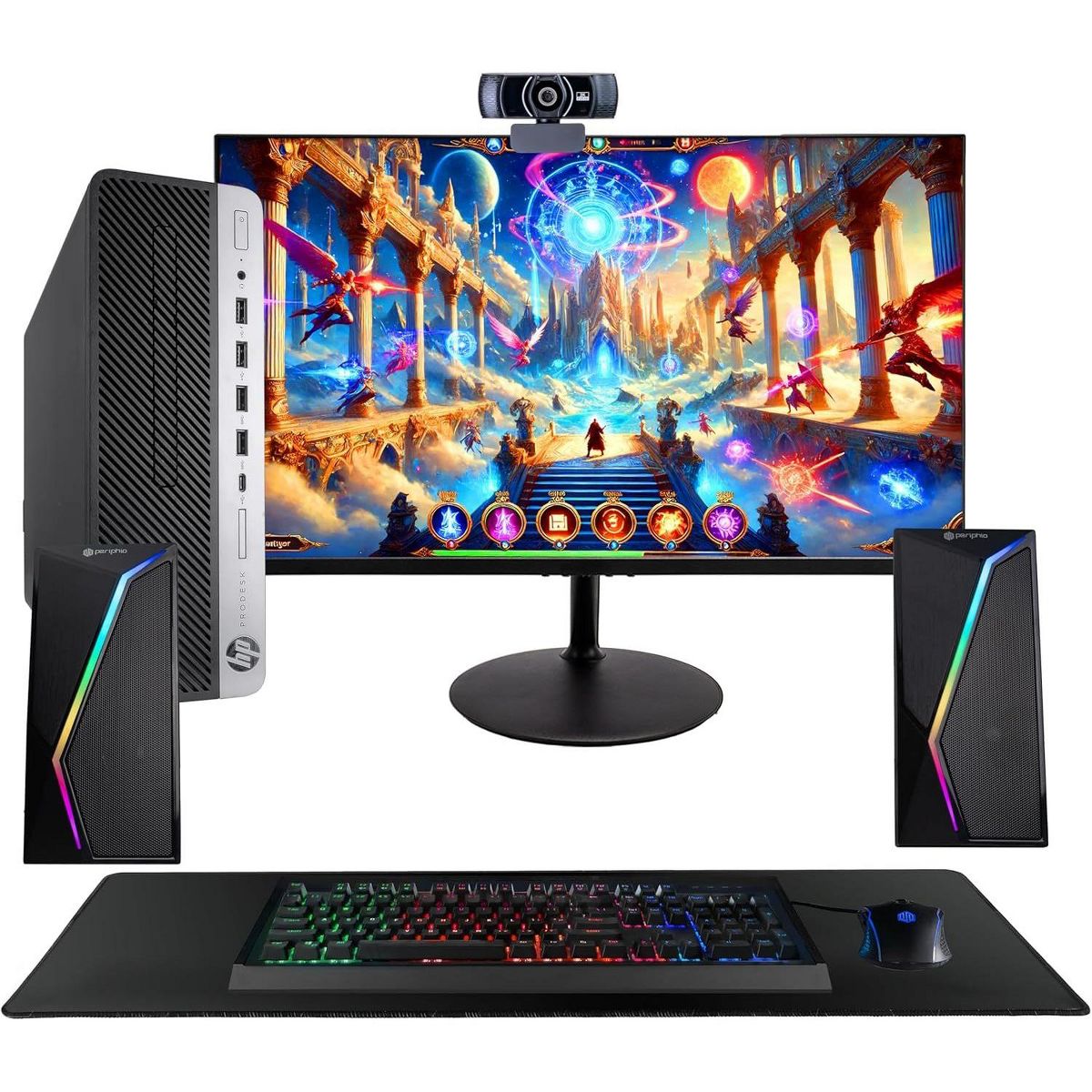 Refurbished HP 600G4 PC Gaming Computer Bundle - 24" Periphio Gaming Monitor-RGB Keyboard, Speakers, & Mouse - 2K Webcam-Manufacturer Refurbished
