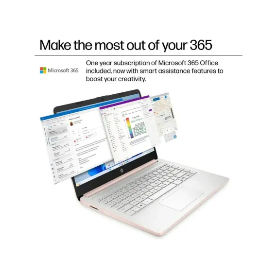 Performance to do more. All-day long. Designed to keep you productive and entertained, this HP 14-inch laptop PC features Copilot key for AI assistance, long battery life and a thin and portable design. Bring your ideas to life with the included one year subscription of Microsoft 365 including Word, Excel, and PowerPoint. Now with smart assistance features to make all you do more powerful..
