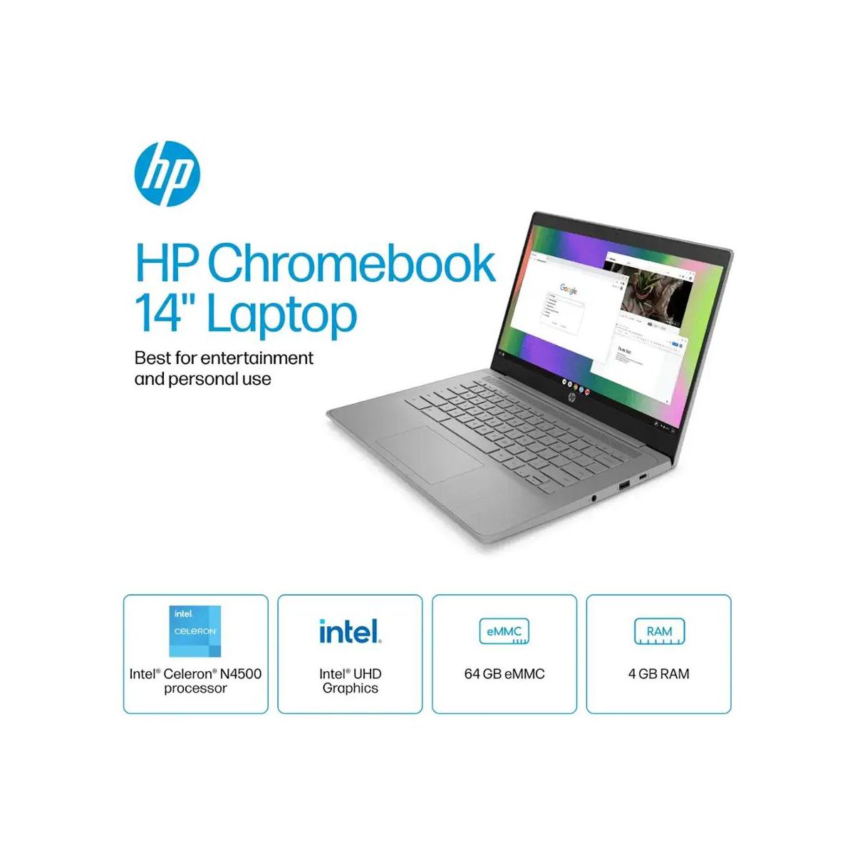 HP Chromebook 14” HD Laptop, Intel Celeron N4500, 4GB RAM, 64GB eMMC, Chrome OS