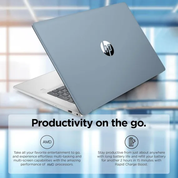 HP 17.3" Business Laptop offers a blend of performance, storage, and usability for professionals, students, and everyday users. It is powered by an AMD Ryzen 5 7430U processor with 6 cores, 12 threads, and a maximum turbo frequency of 4.3 GHz, delivering smooth performance for multitasking, productivity applications, and light media work. The integrated AMD Radeon Graphics enhances visual performance on the large 17.3" HD+ touchscreen, featuring a 1600×900 resolution, anti-glare coating, 250-nit brightness, and 60% NTSC color coverage, providing a comfortable and clear viewing experience. Equipped with 8GB of high-bandwidth RAM, the laptop can handle multiple applications and browser tabs simultaneously, while the 512GB PCIe NVMe M.2 SSD ensures fast boot times and quick access to files, making it easy to store essential documents and media. Connectivity options include a USB Type-C port, two USB Type-A ports, HDMI 1.4b, a headphone/microphone combo jack, and an AC smart pin for charging, supporting a wide range of peripherals. Additional features such as a backlit keyboard for low-light typing, a fingerprint reader for secure logins, an integrated webcam, Wi-Fi 6 for modern wireless performance, and Windows 11 Pro enhance security and usability, all within a sleek blue chassis ideal for professional and personal use.