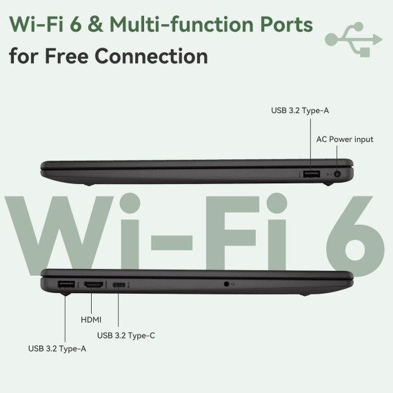 The laptop features a vibrant 15.6-inch Full HD (1920×1080) IPS display with anti-glare technology, micro-edge bezels, 250 nits brightness, and 45% NTSC color for crisp, comfortable viewing in a variety of environments. Connectivity is abundant with USB Type-C, two USB Type-A ports, HDMI, a headphone/mic combo jack, Wi-Fi 6, Bluetooth, and a 720p HD webcam equipped with temporal noise reduction and a privacy shutter for clear, secure communication.