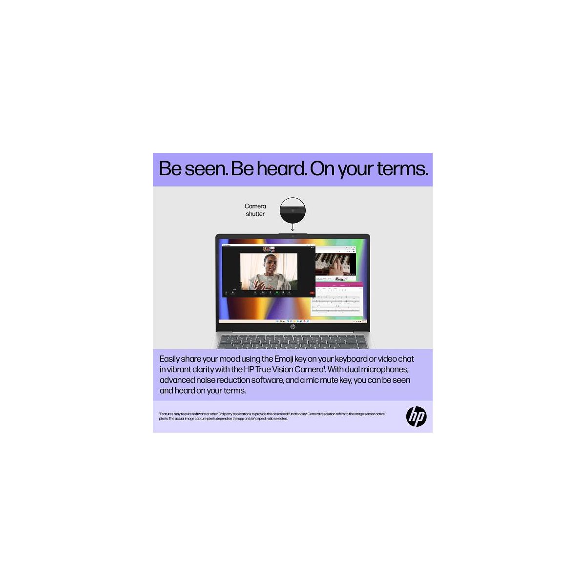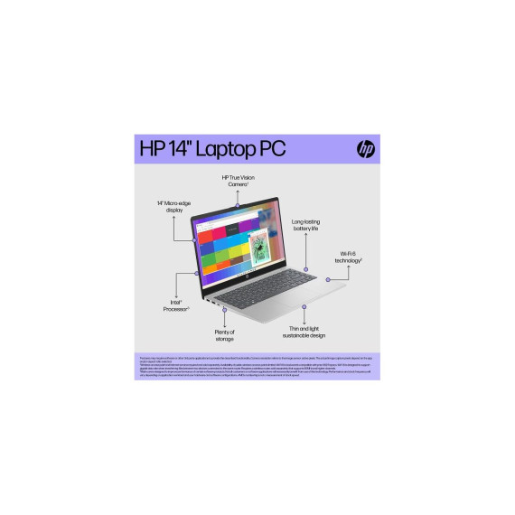 Overview - Take on the day with the HP 14" Laptop PC and powerful Intel® Core™ Ultra Processor with built-in AI. The Copilot hotkey instantly launches the AI assistant for smooth multitasking and fast Wi-Fi, high-quality camera and dual array mics let you enjoy call clarity - all this in a thoughtfully designed PC made with recycled plastics. Features Your all-day, AI device for productivity - Get it all done with the AI-ready Intel® Core™ Ultra Processor, Copilot Key and plenty of storage. Big views and reliable connectivity - Connect and enjoy the view with 178-degree wide-viewing angles, full-function USB Type-C® port and fast Wi-Fi. Connect and collaborate on your terms - Connect clearly with a sharp display, camera with privacy door, dual mics, and temporal noise-reduction. Built for a better tomorrow - The PC is EPEAT® Gold Registered, ENERGY STAR® Certified, and designed with recycled materials. Software included - ; McAfee Online Protection 30-day trial; PC Game Pass 3-month trial Copilot in Windows with Copilot key HP Support Assistant; HP Connection Optimizer; HP BIOS Protection; OMEN Gaming Hub; myHP Disclaimers - Multi-core is designed to improve performance of certain software products. Not all customers or software applications will necessarily benefit from use of this technology. Performance and clock frequency will vary depending on application workload and your hardware and software configurations. Intel’s numbering is not a measurement of higher performance. - Copilot in Windows requires Windows 11. Some features require an NPU. Timing of feature delivery and availability varies by market and device. Requires Microsoft account to log in. Where Copilot is not available, the Copilot key will lead to the Bing search engine. See http://aka.ms/WindowsAIFeatures. - Features may require software or other 3rd party applications to provide the described functionality. Internet service required and not included. - Based on U.S. EPEAT® registration according to IEEE 1680.1-2018 EPEAT®. EPEAT® status varies by country. - ENERGY STAR and the ENERGY STAR logo are registered trademarks of the U.S. Environmental Protection Agency. - Not all features are available in all editions or versions of Windows. Systems may require upgraded and/or separately purchased hardware, drivers, software or BIOS update to take full advantage of Windows functionality. Windows is automatically updated and enabled. High speed internet and Microsoft account required. ISP fees may apply and additional requirements may apply over time for updates. - The flicker-free capability eliminates screen flickering through integrating DC-dimming LED backlights. - Full high-definition (FHD) content is required to view FHD images. - Keyboard components contain post-consumer recycled plastic. Percentage of post consumer recycled contained in each component varies by product. - EPEAT® Gold registered where applicable.EPEAT registration varies by country. Seewww.epeat.net for registration status by country. - PC Game Pass: Subscription continues automatically at regular monthly price unless cancelled. Subject to xbox.com/subscriptionterms. Terms and exclusions apply. Game catalog varies over time, by region, and by device. All rights reserved. Xbox.com/pcgamepass, ea.com/ea-play/terms.Three month trial for devices purchased after October 2024. Microsoft account required. Offers available in select regions only. Credit card required. After promotional period, subscription automatically continues at the then-current regular price (subject to change), unless cancelled, plus applicable taxes. For cancellation details, seexbox.com/cancel. For complete details see terms and conditionshttps://www.xbox.com/en-US/xbox-game-pass?msockid=3f8c879b624a6bb10ac4924e63d86a01 - Copilot key feature availability varies by market, see aka.ms/keysupport