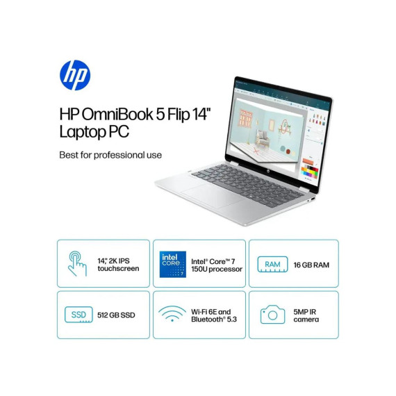 HP OmniBook 5 Flip 14” Full HD+ (1920 x 1200) 2-in-1 Touchscreen Laptop, Intel Core 7 150U, 16GB RAM, 512GB SSD, Windows 11 Home
