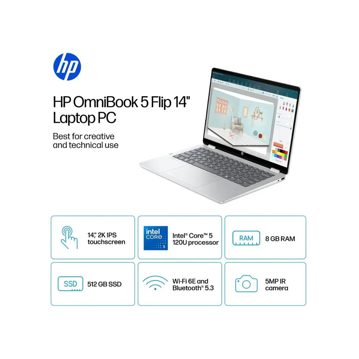 HP OmniBook 5 Flip 14” Full HD+ 2-in-1 Touchscreen Laptop, Intel Core 5 120U, 8GB RAM, 512GB SSD, Windows 11 Home