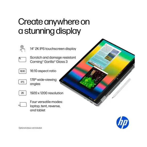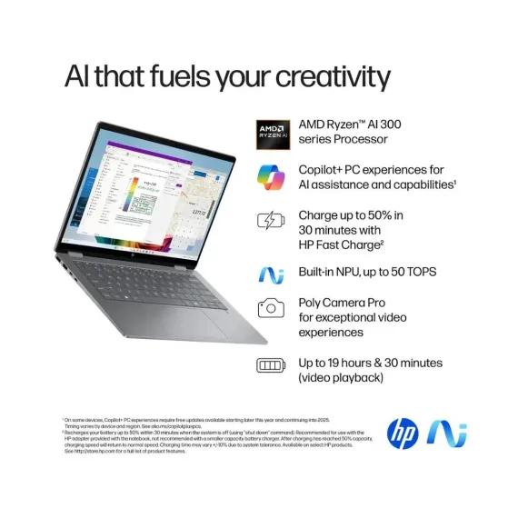 Let creativity reign with the HP OmniBook X Flip 14” Next Gen AI PC. With 4 versatile modes, this thin and light Next Gen AI PC enables you to work and play from anywhere, at any angle. Find peace of mind with the power of the AMD Ryzen AI processor. This built-in NPU enables AI apps to run locally, keeping your data secure and letting you create with or without an internet connection. Together with the all-day, fast-charge battery and personalized AI assistants, you’ve got the power, security, and efficiency to create as long as you want, anywhere. Enhance your device’s endurance with Corning® Gorilla® Glass 3, engineered for unparalleled scratch resistance. Helps reduce accidental damage with strong, more durable protection than most displays. Enjoy clearer team conversations with AI Noise reduction. Using the Advanced Personal Mode, it tracks only your voice during conference calls while automatically filtering out noises and other speakers for distinctively focused communications. Say goodbye to choppy gameplay and enjoy tear free, seamless visuals across all your games. AMD FreeSync™ display technology optimizes refresh rates for flawless sync with your graphics..
