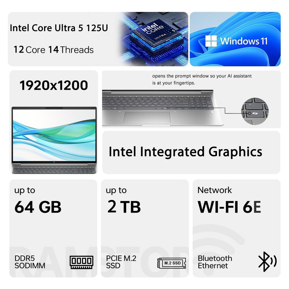 HP ProBook 460 G11, 16" FHD+ Non-touch, Core Ultra 5 125U, 16GB RAM, 1TB SSD, Wi-Fi 6, Win 11 Pro, Silver