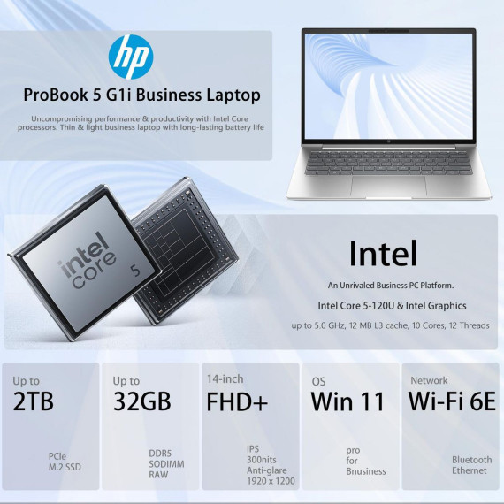 HP ProBook 5 G1i Laptop, 14" FHD+ 1920×1200 Non-touch, i5-120U, Intel Graphics, 16GB DDR5, 1TB SSD, Wi-Fi 6, Windows 11 Pro, Silver