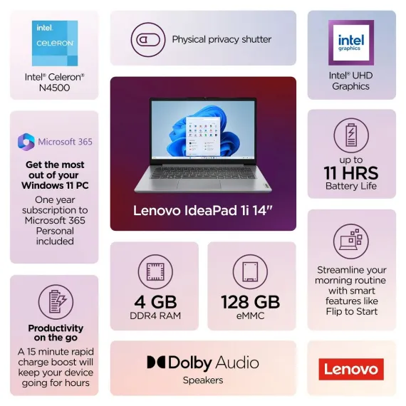 The IdeaPad 1i raises the bar on every affordable laptop with a super-efficient Intel Celeron processor in a thin and compact 17.9 mm chassis that makes multitasking a breeze while boosting energy efficiency with up-to-11 hours of battery life and rapid charge. Get more value with four-sided narrow bezels for maximum screen, Dolby Audio speakers and Flip to Start for instant bootup. Optimize your video call experience with a 720P camera that comes with a privacy shutter to keep out prying eyes and Smart Noise Cancelling to cut out back ground noise..