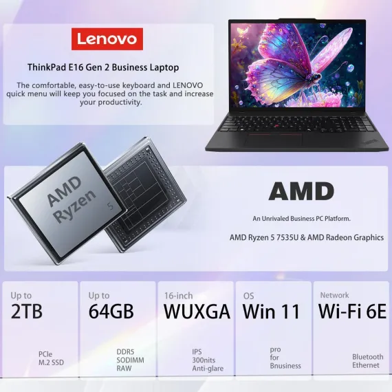 Lenovo ThinkPad E16 Gen 2 Business Laptop is a powerhouse designed for professionals requiring extreme performance, multitasking capabilities, and robust security. It is equipped with an AMD Ryzen 5 7535U processor, featuring 6 cores, 12 threads, and up to 4.55 GHz max turbo frequency, delivering fast and efficient performance across demanding workloads. The massive 64GB high-bandwidth DDR5 RAM ensures seamless multitasking, allowing multiple applications and browser tabs to run simultaneously without lag, while the 1TB PCIe NVMe M.2 SSD provides rapid bootups, quick file access, and ample storage for large datasets. The 16" WUXGA (1920×1200) IPS display with anti-glare coating, 16:10 aspect ratio, 300-nit brightness, 45% NTSC color coverage, and TÜV Low Blue Light certification ensures a clear, comfortable viewing experience for extended work sessions. Connectivity options include two USB-C ports, two USB-A ports, HDMI, RJ45 Ethernet, and a headphone/microphone combo jack, alongside Wi-Fi 6 and Bluetooth for versatile networking. Security and usability are enhanced with a fingerprint reader, backlit keyboard, and advanced system protection features to safeguard data and identity. Bundled with a 64GB ADATA USB flash drive and running Windows 11 Pro, this ThinkPad delivers unmatched performance, security, and flexibility for business professionals.