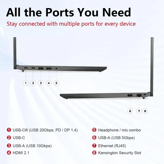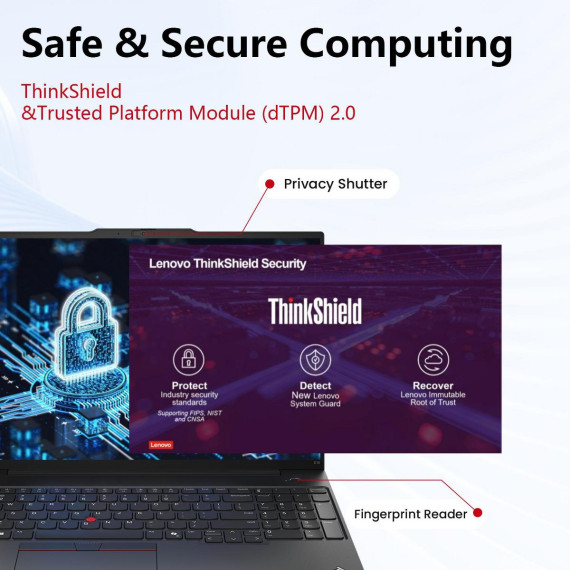 Lenovo ThinkPad E16 Gen 2 is a 16" business laptop combining performance, productivity, and versatility. Its FHD+ IPS touchscreen (1920x1200, 16:10, 300 nits, TÜV Low Blue Light) delivers crisp visuals, while the Intel Core Ultra 7 155U processor (12 cores, 14 threads, up to 4.8GHz) with 16GB DDR5 RAM and 1TB PCIe SSD ensures smooth multitasking and fast data access. Connectivity includes USB-C/Thunderbolt 4, USB-A, HDMI, Ethernet, Wi-Fi 6, Bluetooth, and a 1080p webcam with privacy shutter. Windows 11 Pro with AI Copilot provides enterprise-grade security, remote management, and AI-enhanced workflow efficiency.