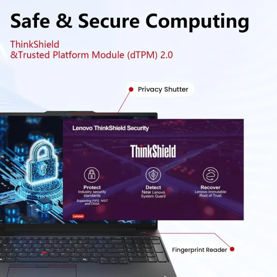 Lenovo ThinkPad E16 Gen 2 is a 16" FHD+ business laptop with a 1920×1200 IPS touchscreen (16:10, 300 nits, TÜV Low Blue Light, 60Hz). Powered by the Intel Core Ultra 7 155U processor (12 cores, 14 threads, up to 4.8GHz) with 32GB DDR5 RAM and 1TB PCIe SSD, it delivers fast multitasking and rapid data access. Connectivity includes Thunderbolt 4 USB-C, USB-A, HDMI, Ethernet, Wi-Fi 6, Bluetooth, and a 1080p webcam with privacy shutter. Windows 11 Pro with AI Copilot provides enterprise-grade security, remote management, and AI-enhanced workflow automation for efficient business operations.