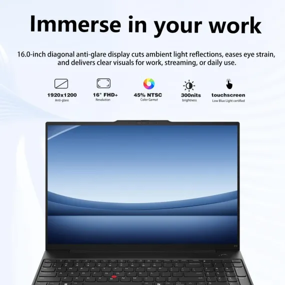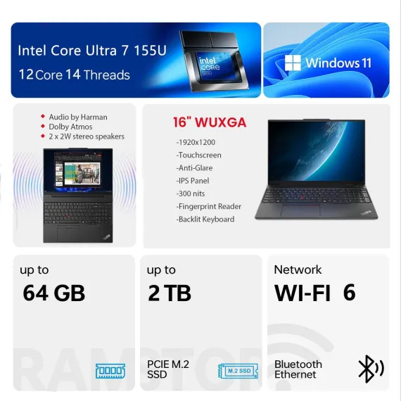 Lenovo ThinkPad E16 Gen 2 is a 16" FHD+ touchscreen business laptop (1920×1200, 16:10, 300 nits, TÜV Low Blue Light, 60Hz) powered by Intel Core Ultra 7 155U (12 cores, 14 threads, up to 4.8GHz) with 64GB DDR5 RAM and 1TB PCIe SSD for lightning-fast multitasking and rapid data access. Connectivity includes Thunderbolt 4 USB-C, USB-A, HDMI, Ethernet, Wi-Fi 6, Bluetooth, and a 1080p webcam with privacy shutter. Windows 11 Pro with AI Copilot provides enterprise-grade security, remote management, and AI-driven workflow automation for smarter, more efficient business productivity.