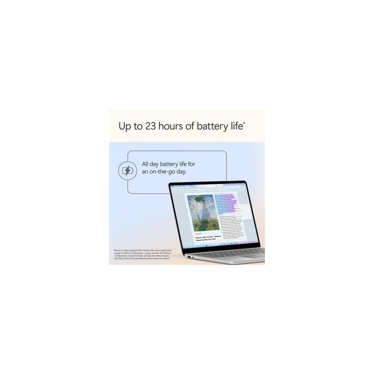 Please note this product releases on May 20th, 2025 and will not be made available until that date. Meet Surface Laptop 13", a Copilot+ PC and the most portable Surface Laptop. With built-in AI experiences and plenty of colors, it delivers unbeatable intelligence, value, and style. And you can leave your charger at home because this 13" touchscreen powerhouse boasts all-day battery life. Copilot+ PC. A new AI era begins Turn your ideas from text prompts into generated artwork. With Recall*, search across time to find the content you need. Understand new languages instantly with Live Captions. Copilot+ PCs powered by the Snapdragon X Plus processor come with 45 Trillion Operations Per Second of NPU power, and theyre all set to transform the way you create, find and communicate. Brilliant Display Immersive Brilliance or Incredible image quality The 13" PixelSense Flow touchscreen offers a vibrant and immersive viewing experience. All-day Energy Up to 23 hours of battery life for local video playback for uninterrupted streaming. Power up Built with the latest Qualcomm Snapdragon X Plus 8 Core processors, Surface Laptop delivers powerful performance and AI accelerated power. Turbocharged NPU Surface Laptop features the Qualcomm Hexagon NPU that delivers up to 45 TOPs designed to accelerate AI experiences. Express your style Surface Laptop comes in three new colors Violet, Ocean, and Platinum. The ports you need Charge on-the-go, transfer data fast, or create the ultimate desktop set up with two USB-C 3.2 ports. Type with perfection Optimal key travel for swift, accurate typing and enhance your productivity with a large precision touchpad. You are the security Windows Hello is a faster, more personal, more secure way to get instant access to your devices using only your fingerprint there's no password to remember.