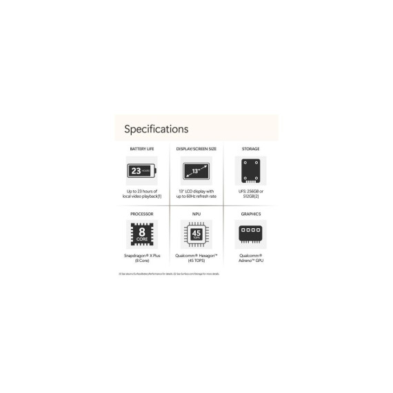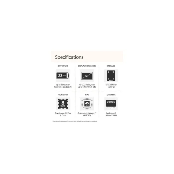 Please note this product releases on May 20th, 2025 and will not be made available until that date. Meet Surface Laptop 13", a Copilot+ PC and the most portable Surface Laptop. With built-in AI experiences and plenty of colors, it delivers unbeatable intelligence, value, and style. And you can leave your charger at home because this 13" touchscreen powerhouse boasts all-day battery life. Copilot+ PC. A new AI era begins Turn your ideas from text prompts into generated artwork. With Recall*, search across time to find the content you need. Understand new languages instantly with Live Captions. Copilot+ PCs powered by the Snapdragon X Plus processor come with 45 Trillion Operations Per Second of NPU power, and theyre all set to transform the way you create, find and communicate. Brilliant Display Immersive Brilliance or Incredible image quality The 13" PixelSense Flow touchscreen offers a vibrant and immersive viewing experience. All-day Energy Up to 23 hours of battery life for local video playback for uninterrupted streaming. Power up Built with the latest Qualcomm Snapdragon X Plus 8 Core processors, Surface Laptop delivers powerful performance and AI accelerated power. Turbocharged NPU Surface Laptop features the Qualcomm Hexagon NPU that delivers up to 45 TOPs designed to accelerate AI experiences. Express your style Surface Laptop comes in three new colors Violet, Ocean, and Platinum. The ports you need Charge on-the-go, transfer data fast, or create the ultimate desktop set up with two USB-C 3.2 ports. Type with perfection Optimal key travel for swift, accurate typing and enhance your productivity with a large precision touchpad. You are the security Windows Hello is a faster, more personal, more secure way to get instant access to your devices using only your fingerprint there's no password to remember.