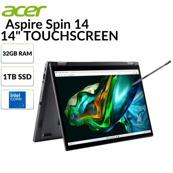 The Acer Aspire Spin 14 is a versatile 2-in-1 touchscreen notebook engineered for dynamic productivity and multimedia enjoyment. Featuring a brilliant 14-inch WUXGA display, this device transforms seamlessly between laptop, tent, display, and tablet modes, adapting effortlessly to your tasks, whether you're working on a detailed project or streaming entertainment. Powering its responsive performance is the Intel Core 7 150U processor, perfectly paired with a substantial 32GB of RAM, ensuring smooth and efficient multitasking across demanding applications. Storage is handled by a capacious 1 TB Solid State Drive (SSD), providing swift boot times and ample space for all your files, media, and software. The sleek Iron chassis gives it a professional and durable finish, while the English keyboard offers a comfortable and familiar typing experience. Optimized for the modern user, the Aspire Spin 14 delivers a premium, highly adaptable computing experience in a portable form factor, making it an excellent choice for students, professionals, and creatives who need power and flexibility on the go.