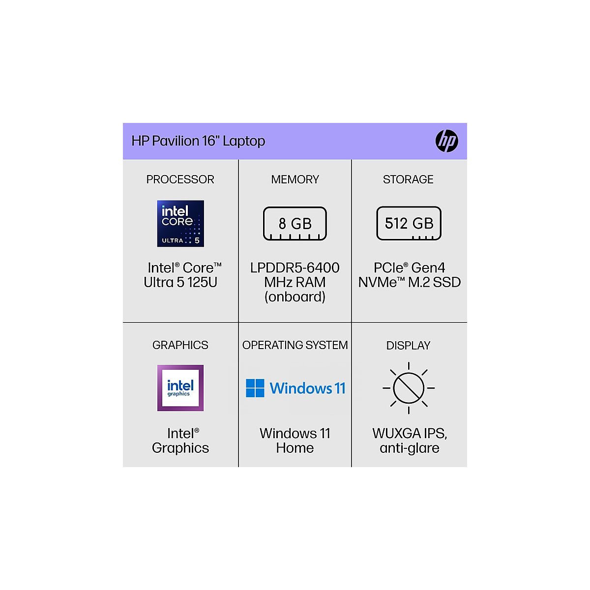 Refurbished: HP Pavilion 16-af00 16" FHD+ Laptop Intel Ultra 5 125U, 8GB, 512GB, W11H - Manufacturer Refurbished