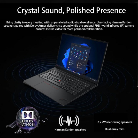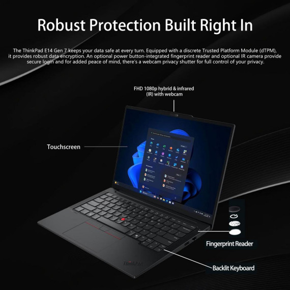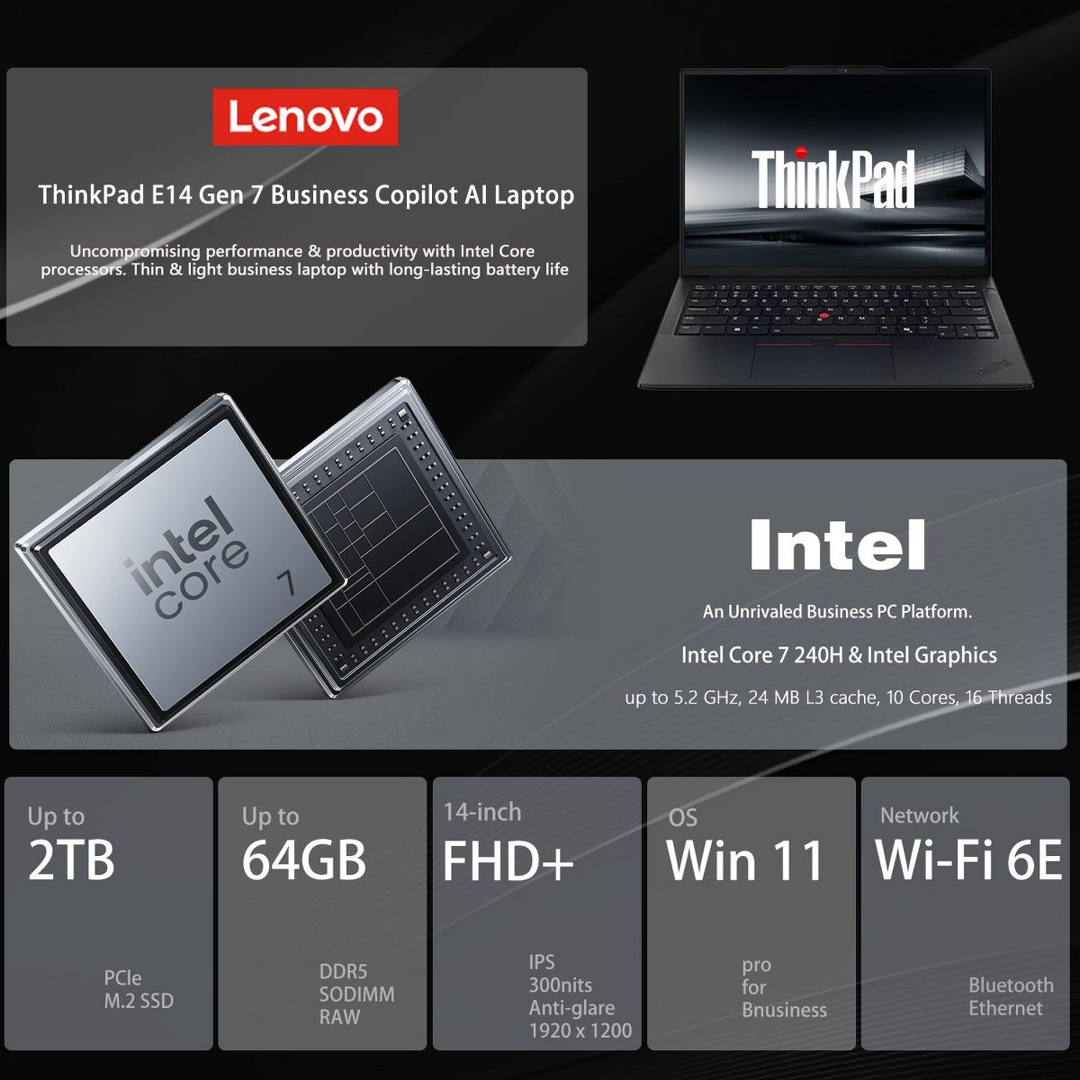 Lenovo ThinkPad E14 Gen 7 is a 14" business laptop designed for power, productivity, and durability. Its FHD+ IPS touchscreen (1920x1200, 16:10, 300 nits, anti-glare, TÜV Low Blue Light) ensures clear visuals, while the Intel Core 7 240H processor (10 cores, 16 threads, up to 5.2GHz) with 32GB DDR5 RAM and 2TB PCIe SSD delivers fast multitasking and responsive performance. Connectivity includes USB-A/C, HDMI, Ethernet, Wi-Fi 6E, Bluetooth, fingerprint reader, and backlit keyboard. Windows 11 Pro provides enterprise-grade tools and security features, including dTPM 2.0 and self-healing BIOS. Built to MIL-STD 810H standards, it ensures reliable, long-lasting use in any environment.