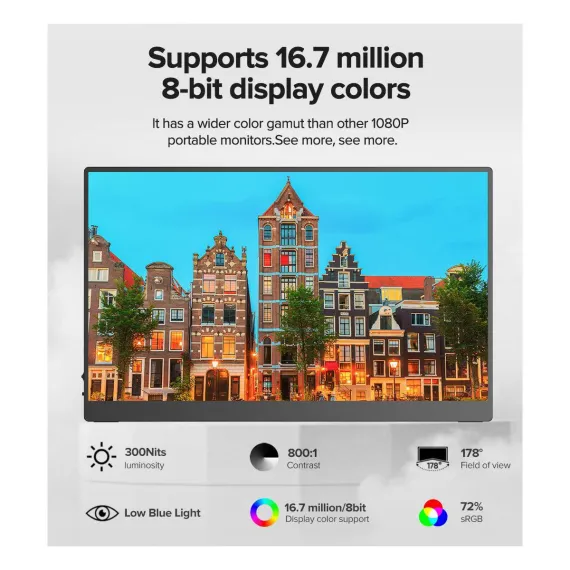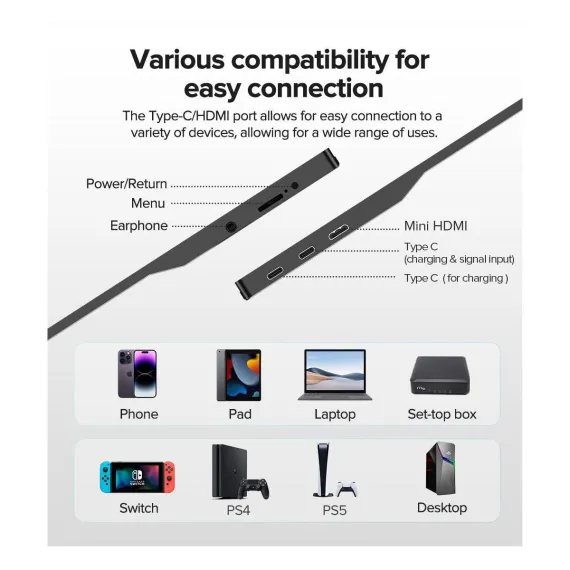 This portable monitor features a 1920x1080P resolution with touch capability, providing a responsive and interactive display for gaming and working on your laptop or computer. To use the touchscreen, ensure your device is connected to the Type-C data port of the monitor, The portable touchscreen monitor ports are labeled. No extra drivers are required.