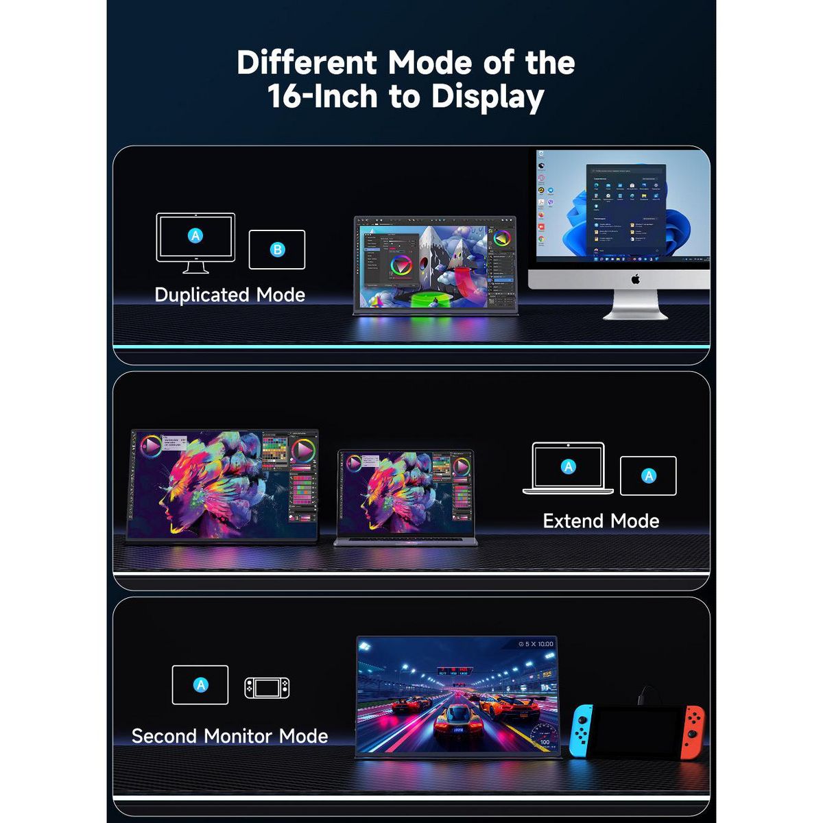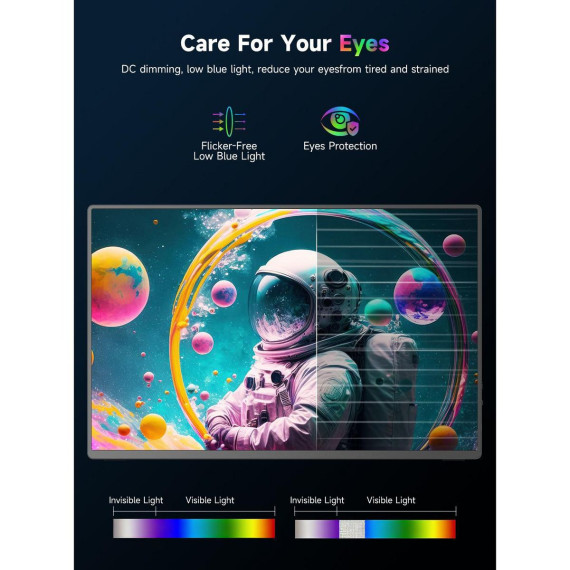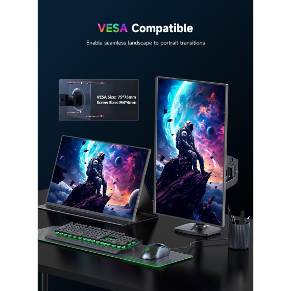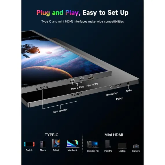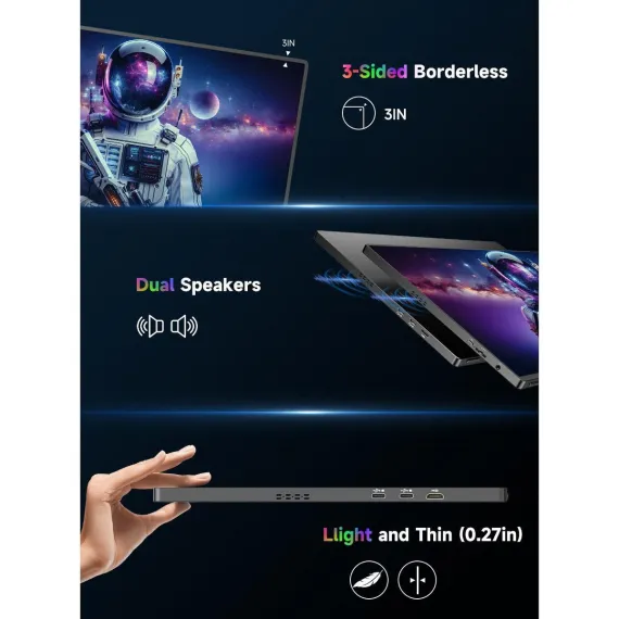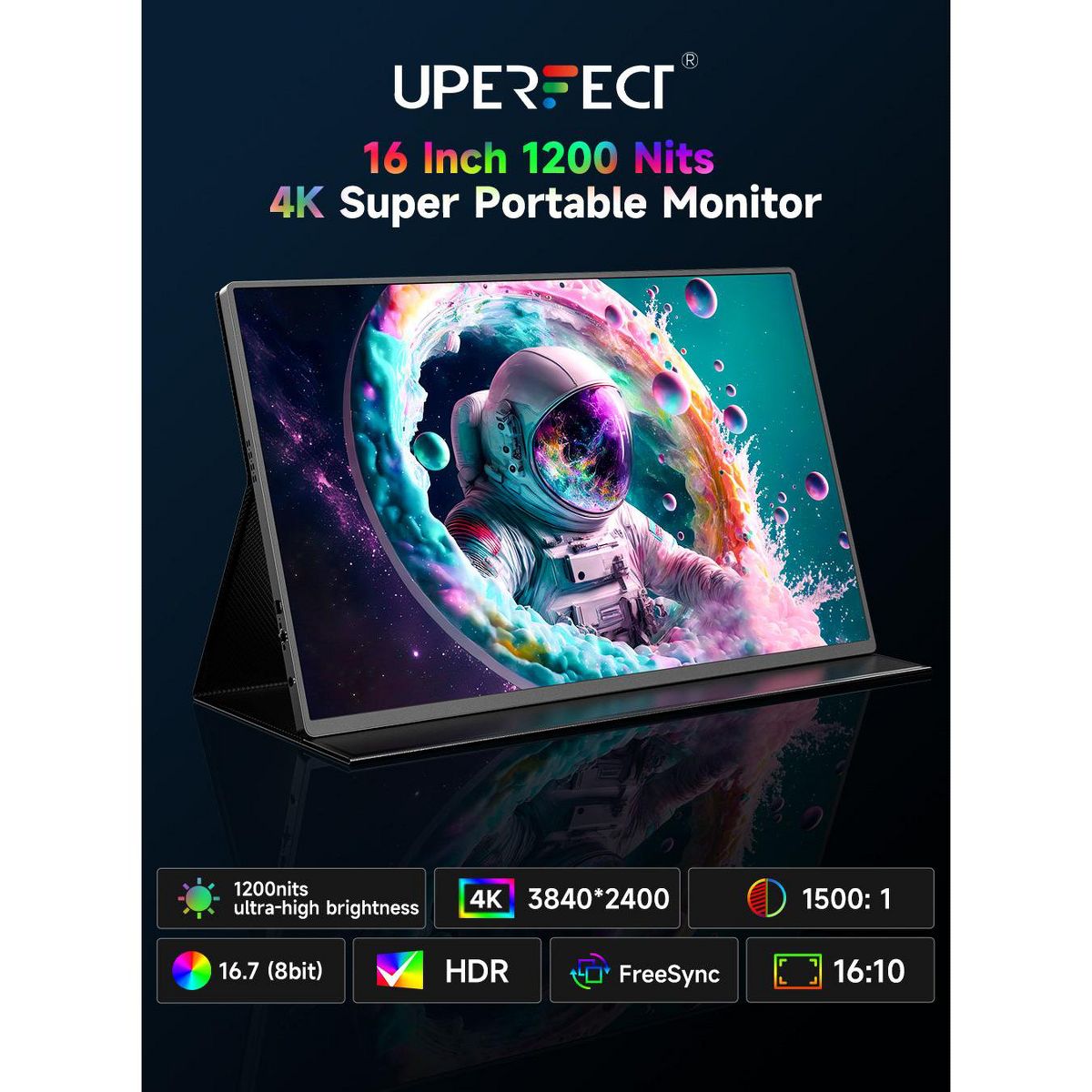 UPERFECT portable monitor equips spectacular IPS A-grade screen with 16 inch, 3840x2400 resolution, 1200 nits brightness, 1500:1 contrast ratio, 100% sRGB, 178 degree wide viewing angle and 60 hz refresh rate. This travel monitor has HDR, Low Blue Light and FreeSync features. It will show crisp color, vivid image and clear detail.
